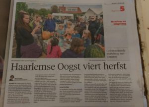 Het was een geweldige workshopdag buiten met oogsten, zingen, oogstverwerken en eten! En het was prachtig weer… Deze workshopdag was geschikt voor kinderen en volwassenen en werd heel goed bezocht. ook verscheen er een leuk artikel over in het Haarlems Dagblad (zie laatste foto hieronder).