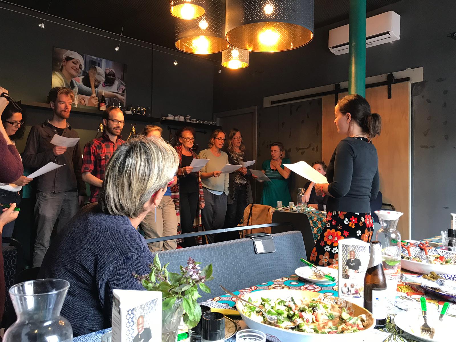 Op deze eerste Haarlem Oogst-festivaldag kon je meedoen aan de zangworkshop Rozemarijn of aan de kookworkshop Syrische lunch bereiden. Na de workshops hebben we gezamenlijk het heerlijks wat klaargemaakt was opeten in het Wereldkeuken-restaurant. We waren met het lied Rozemarijn zelfs nog even op radio Haarlem105 te horen! Na het opruimen en afwassen fietste wie zin had mee naar de Buurttuin, waar we een rondleiding kregen en een pompoen konden oogsten bij Ecoring.