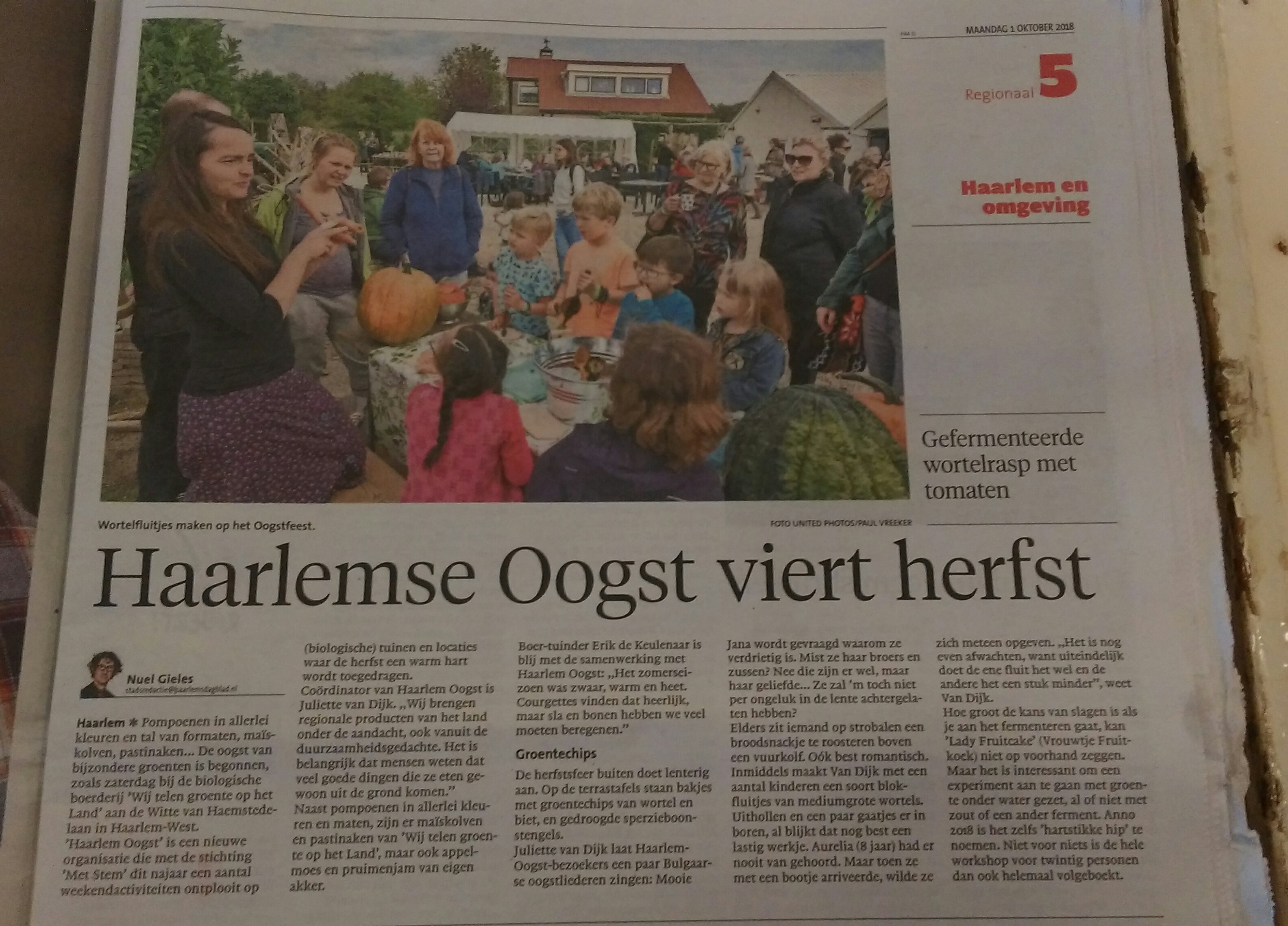 Het was een geweldige workshopdag buiten met oogsten, zingen, oogstverwerken en eten! En het was prachtig weer… Deze workshopdag was geschikt voor kinderen en volwassenen en werd heel goed bezocht. ook verscheen er een leuk artikel over in het Haarlems Dagblad (zie laatste foto hieronder).